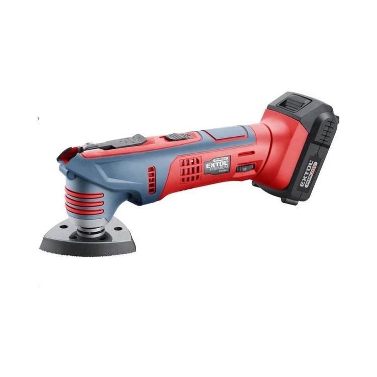 Pre bežnú prácu postačujú jeden alebo dva 2000mAh akumulátory, ktoré môžete rýchlo nabiť v rýchlonabíjačke, pre náročnejších alebo dlhšej práci odporúčame väčšie akumulátory s kapacitou 4000mAh. Akumulátor možno použiť vo všetkých typoch náradia radu EXTOL SHARE20V. Vďaka Li-ion technológii je možné akumulátory kedykoľvek dobíjať, bez toho aby sa tým znižovala ich kapacita. Li-ion akumulátor tiež stráca energiu vplyvom samovybíjania veľmi pomaly a vydržia dlho nabitý. hlavné prednosti: škrabka je určená napr. na odstraňovanie mäkkého tmelu medzi obkladmi, zoškrabovanie tmelu alebo farby ... rýchloupínacie čeľusť zaisťuje jednoduchú beznástrojovú výmenu britov "quick install" zanorovacia list je určený pre vykonávanie výrezov do dreva a mäkších materiálov v zle prístupných miestach ako napr. v rohoch, v inštalovaných kobercových lištách, do veľkých plôch ... regulátor otáčok umožňuje nastavenie otáčok podľa druhu rezaného materiálu akumulátor má indikátor nabitia a možno ho použiť vo všetkých typoch náradia EXTOL SHARE20V